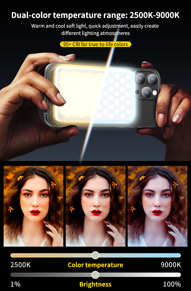 👉 Yes, you can adjust brightness as well as warm (3200K) and cool (5600K) color tones.